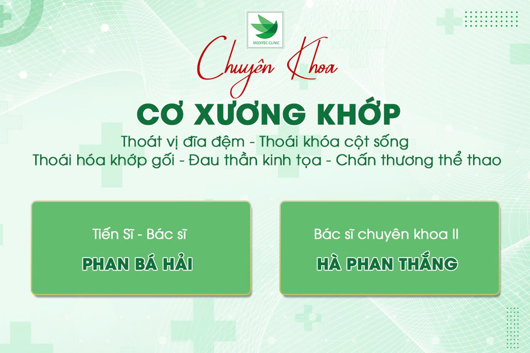 Chuyên khoa Cơ Xương Khớp của Meditec luôn sẵn sàng phục vụ bệnh nhân mọi lứa tuổi với phương châm “Sức khỏe của bạn là niềm tự hào của chúng tôi.”